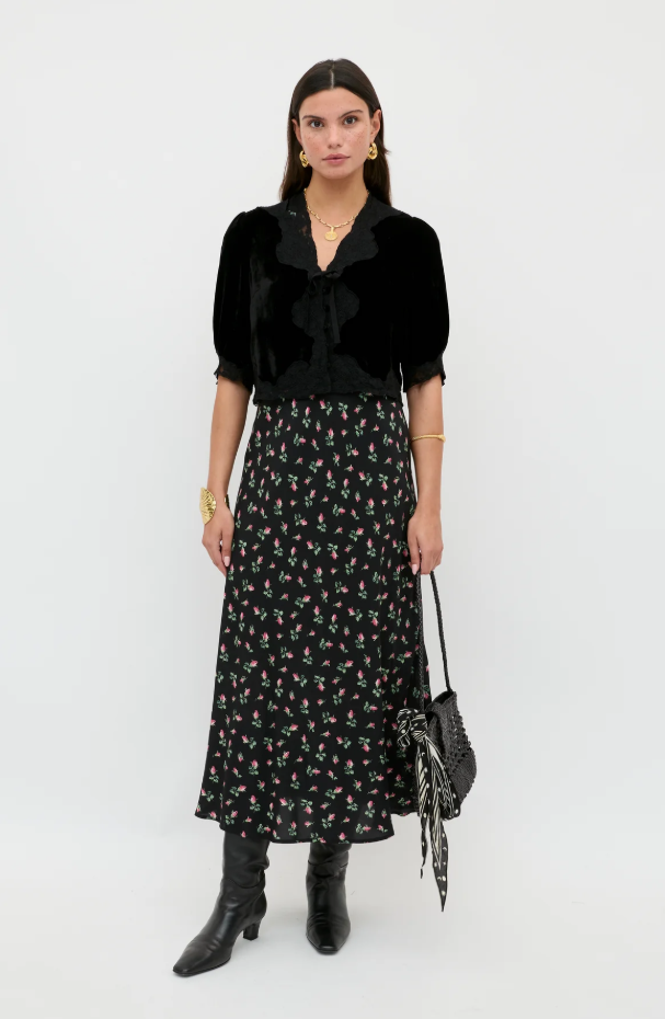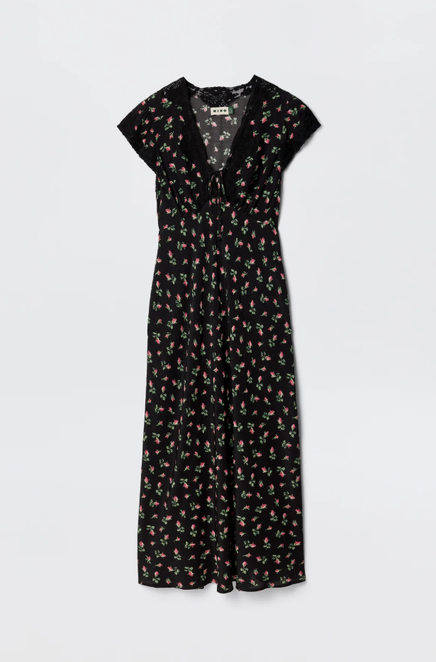 Effortlessly feminine. The Amari Dress features a ditsy white floral print on a classic black base. Designed with a V-neckline, short cap sleeves, and a flattering wrap-front silhouette that ties at the waist, this midi dress flows beautifully with every movement, perfect for both daytime and evening wear.
