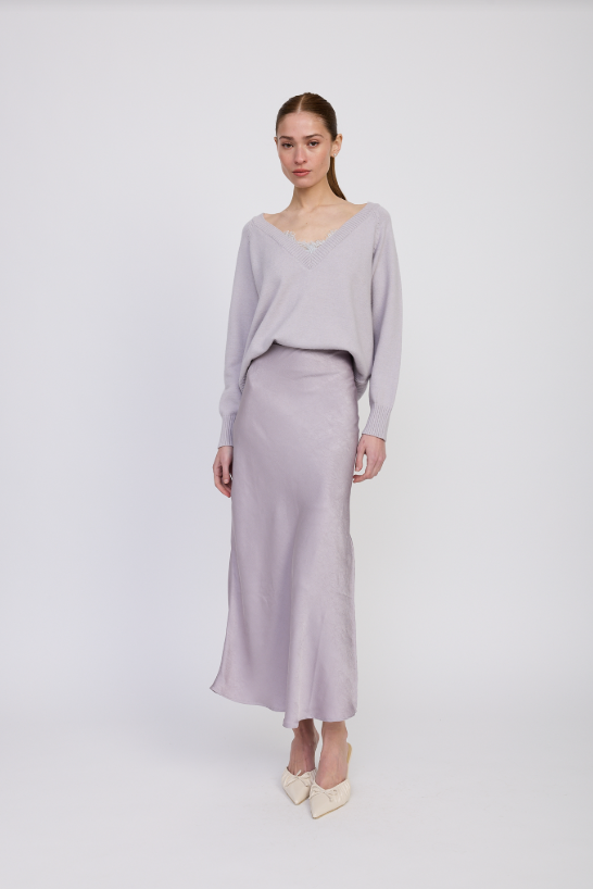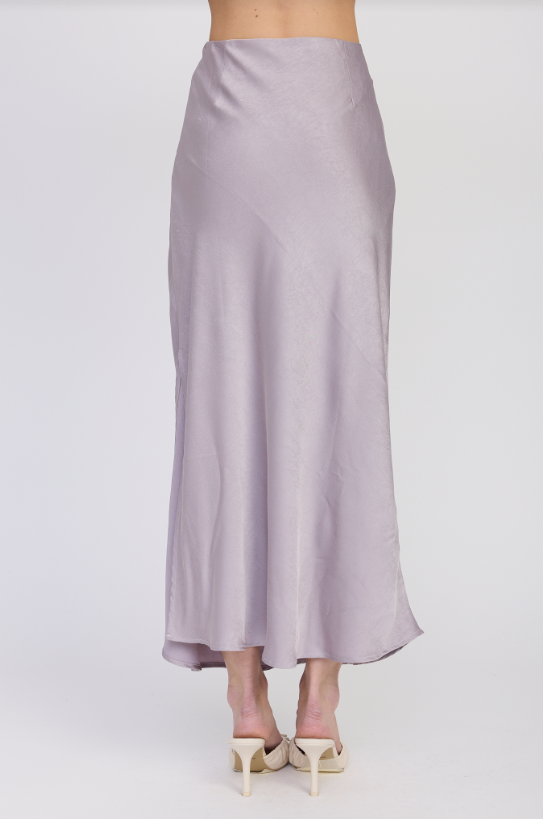 Sleek and feminine. The Aracella Maxi Skirt is a lilac satin slip skirt designed with a bias cut for a graceful drape that flatters every step. Its high-rise waist and fluid silhouette make it the perfect piece to dress up or down with ease.