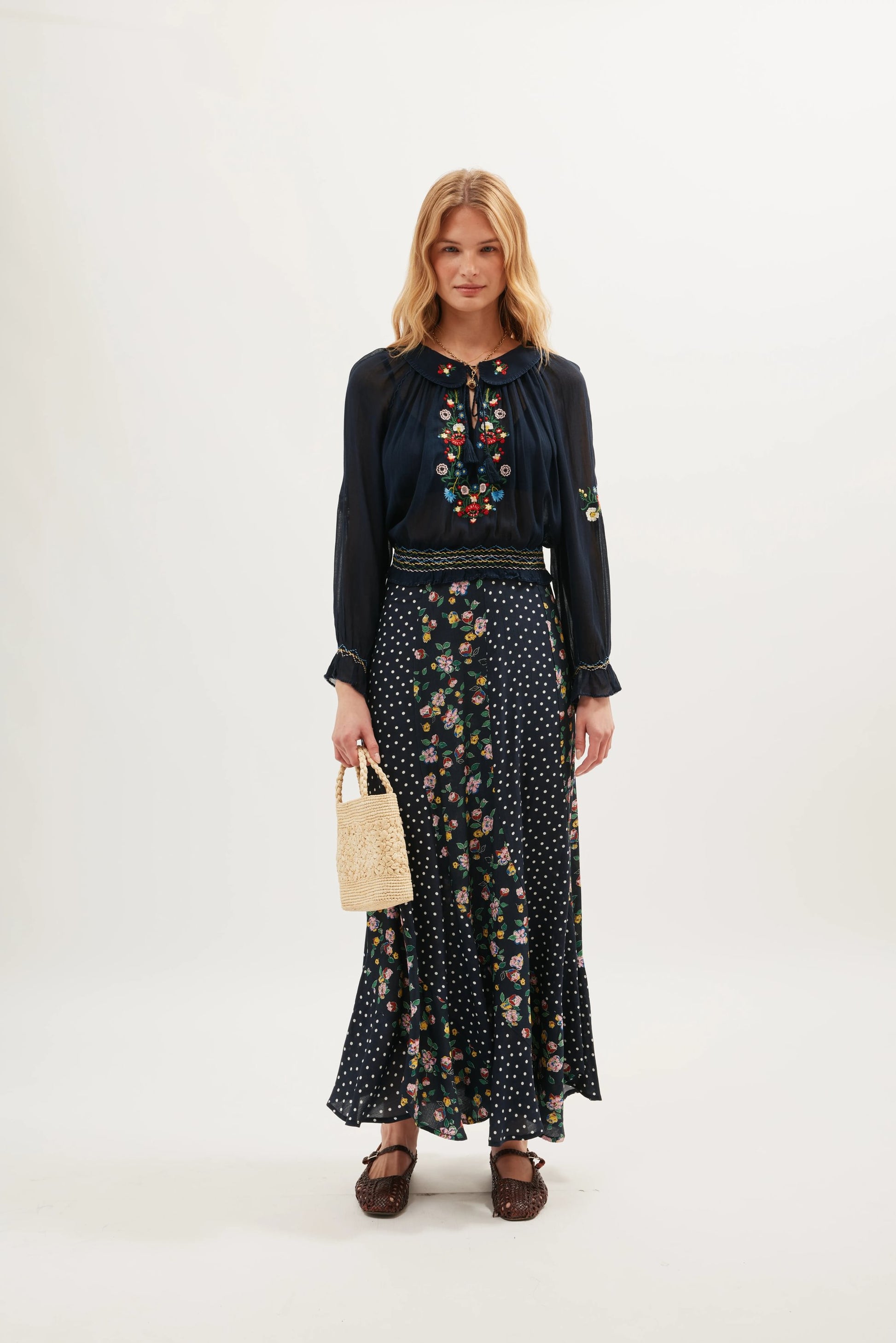 - Multi-colored floral embroidery at neckline and sleeves