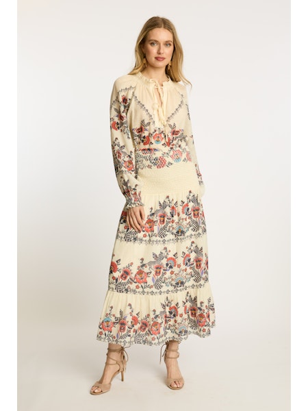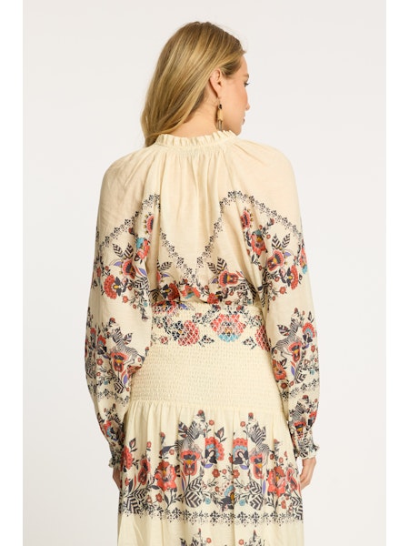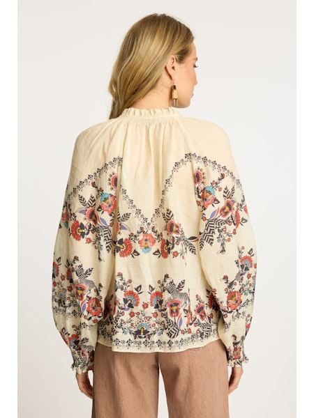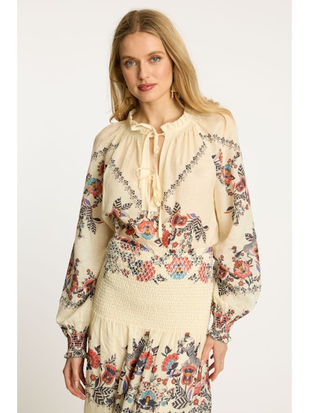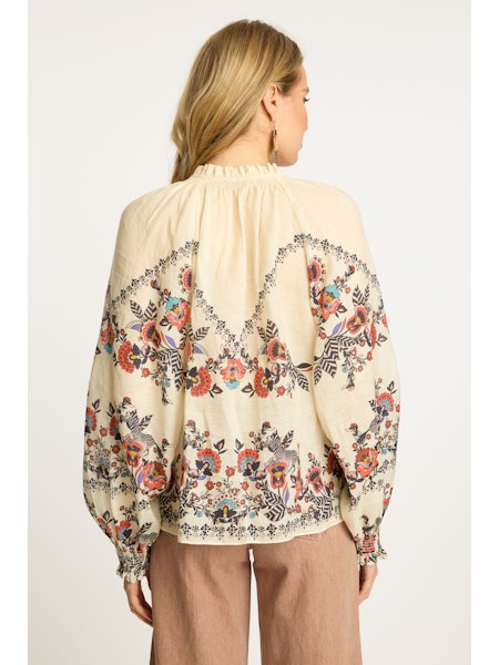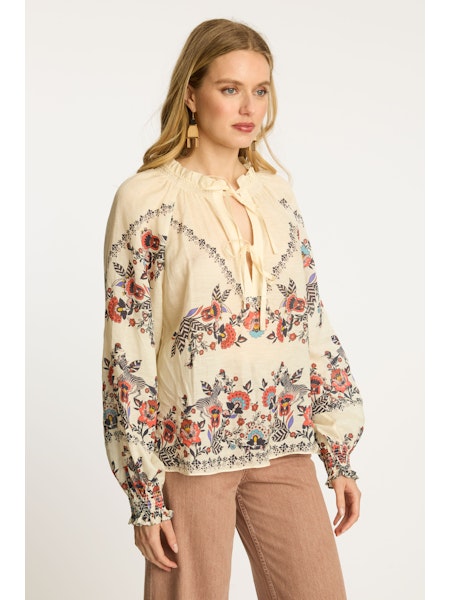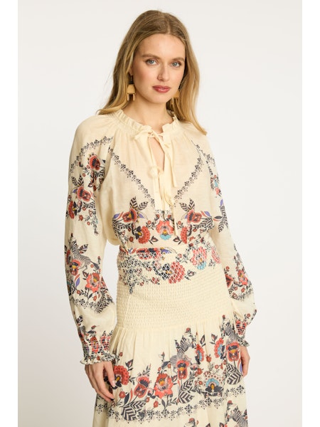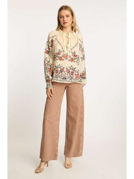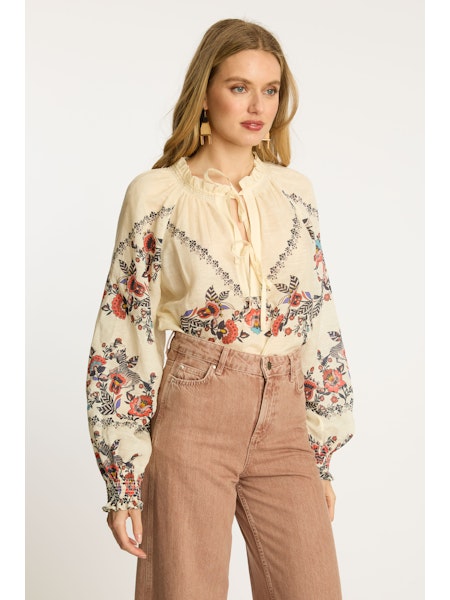 The Vickie Top in Zebra Leaf is a cream blouse adorned with vibrant, multicolored floral embroidery across the yoke and sleeves. Designed with a round neckline, tassel tie strings, and subtle ruffle accents, it exudes a feminine, bohemian charm. The voluminous sleeves and relaxed silhouette make it perfect for effortlessly chic, laid-back looks.